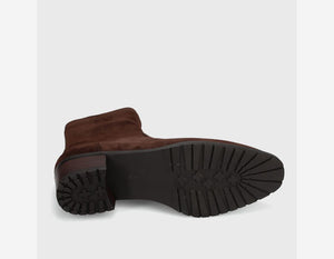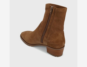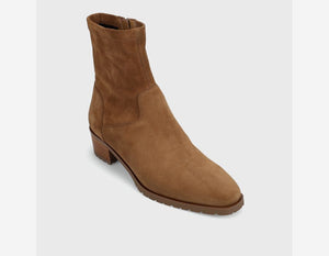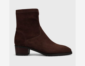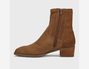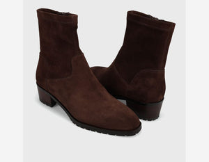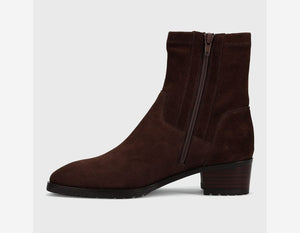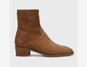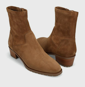 Water-resistant stretch suede ankle boot. Side zip. Padded insole. 1.75 inch stacked heel. Treaded rubber sole.