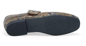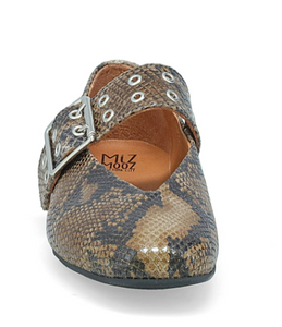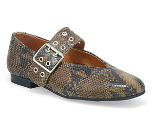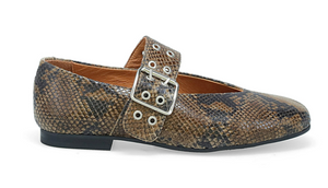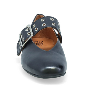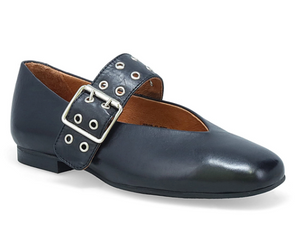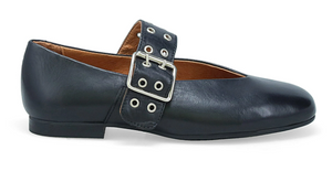 A squared toe and sharp topline bring modern style to this buckled flat shaped from smooth leather and built on a well-cushioned footbed.